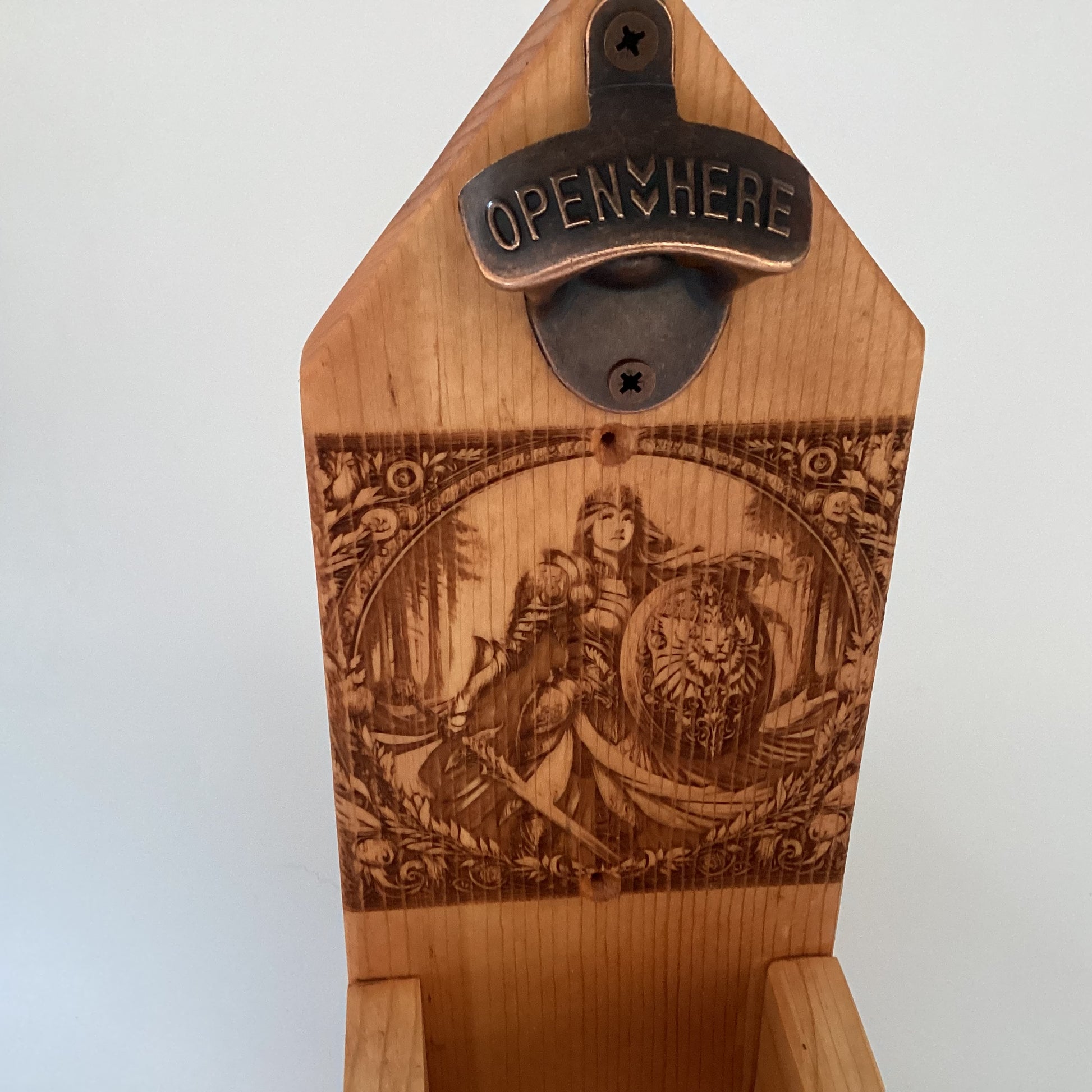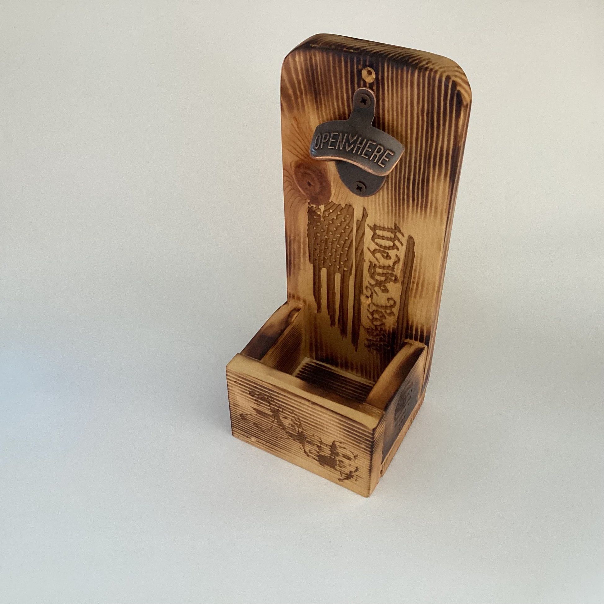 Metal bottle opener mounted on a laser engraved plaque with catch bin for the tops.