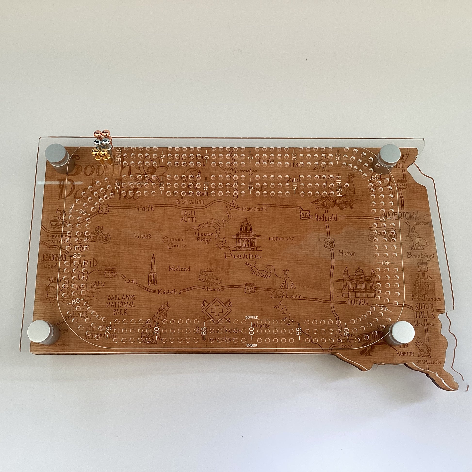 Unique cribbage board for the state of South Dakota. A 2-layer board - top clear acrylic layer playing surface is spaced above a wooden base engraved with cities and points of interest.