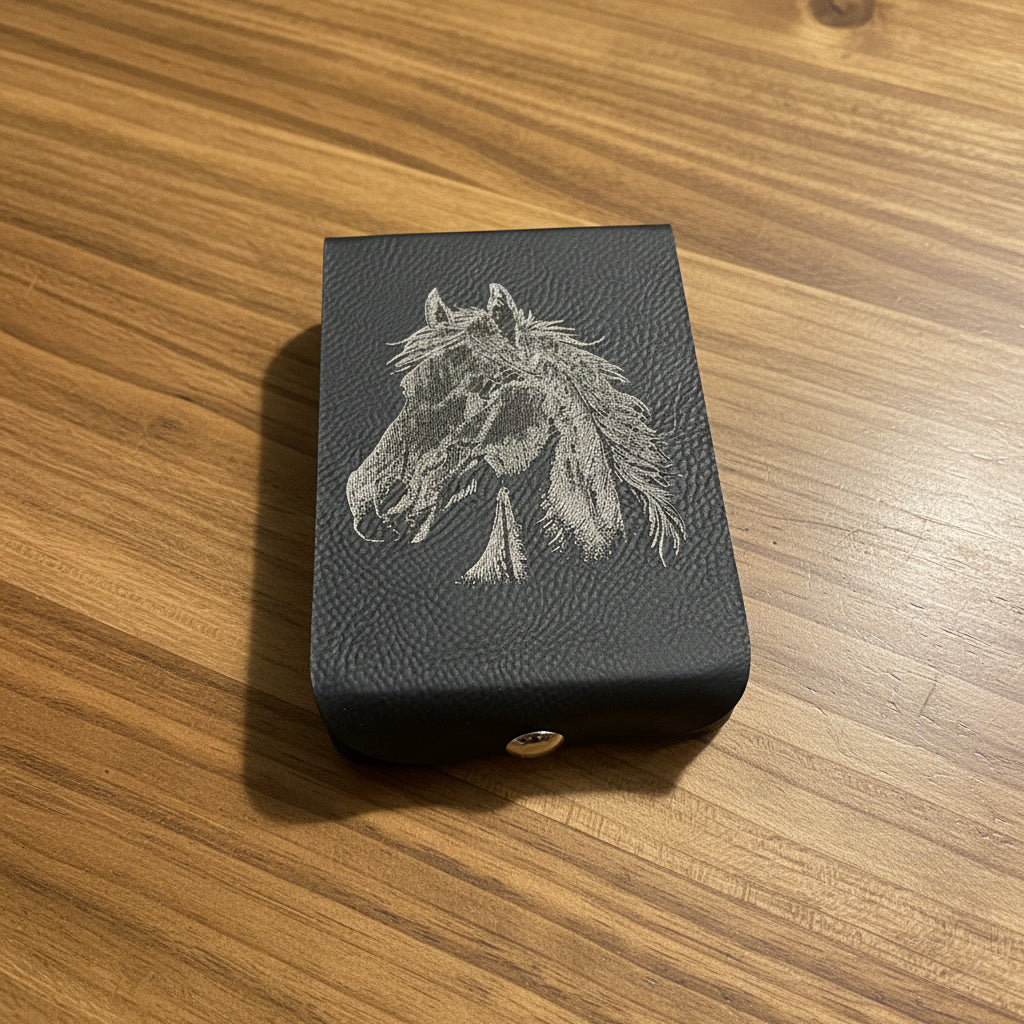 Never leave home without your favorite game. This portable cribbage board combines handcrafted quality with practical design—constructed from basswood plywood with a rich stain finish and topped with a custom laser-engraved leatherette cover. The magnetic closure keeps everything in place, so your cards and pegs stay organized whether you're heading to a friend's house or settling in at a café. A thoughtful gift for any card player.