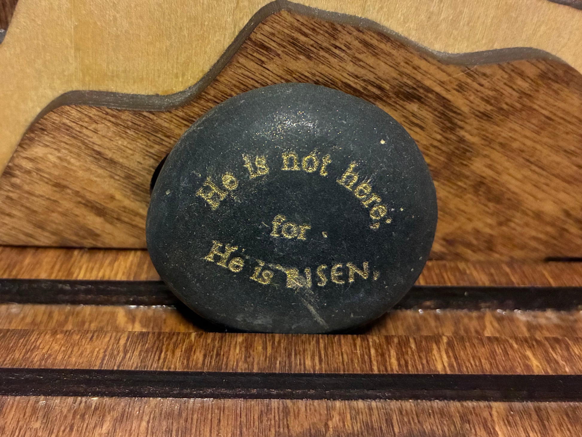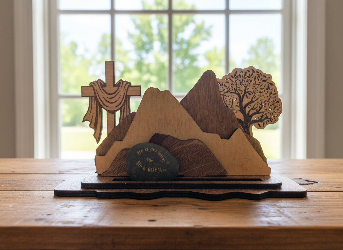 Depiction of Jesus' tomb in layered wood. Stained and finished in polyurethane. A stone engraved with "He is not here for He is Risen as He said." rolls across the tomb opening. There is a choice of the cross with or without the shroud. Measures 9 3/4"L x 5 1/4"H x 3 1/2"W.