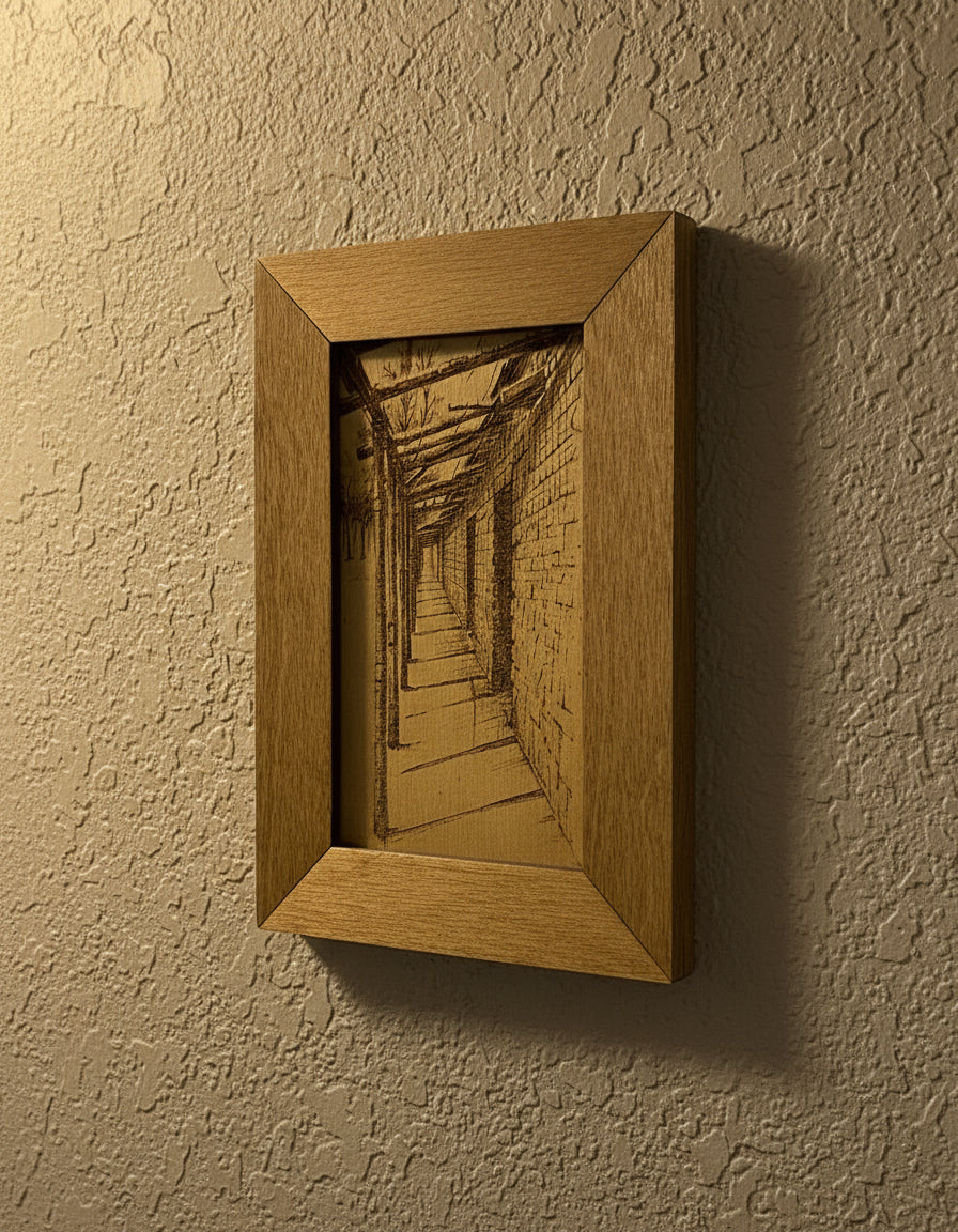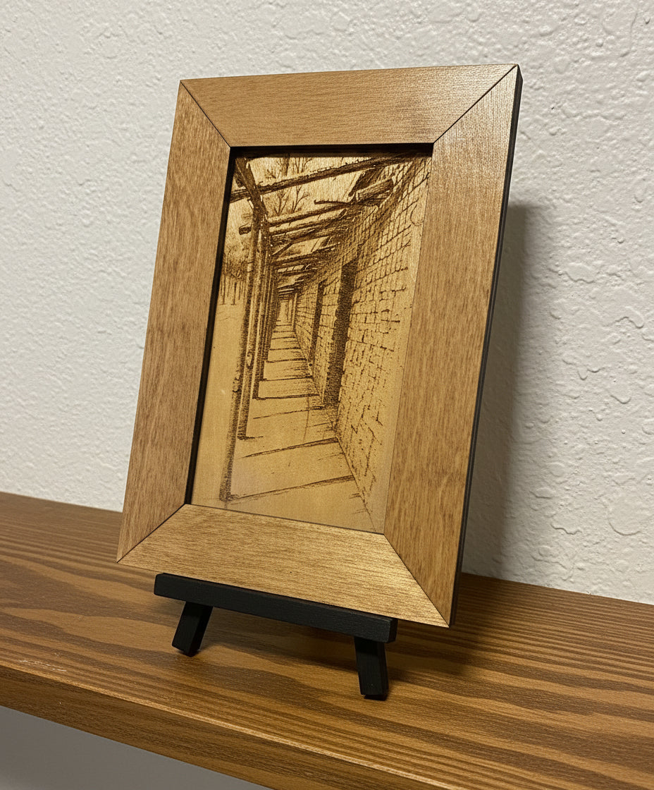This laser-engraved birch piece showcases an architectural study of Mission San Juan's historic living quarters, captured through Horton LaserCraft Co-Owner Roger Horton's lens and rendered with precision detail. The composition emphasizes the mission's distinctive front facade, making it equally striking displayed on a wall or propped on an easel. Crafted from quality birch with careful attention to tonal depth, this 5 1/4" x 7 3/4" piece brings authentic Texas heritage into your space with understated sophistication.