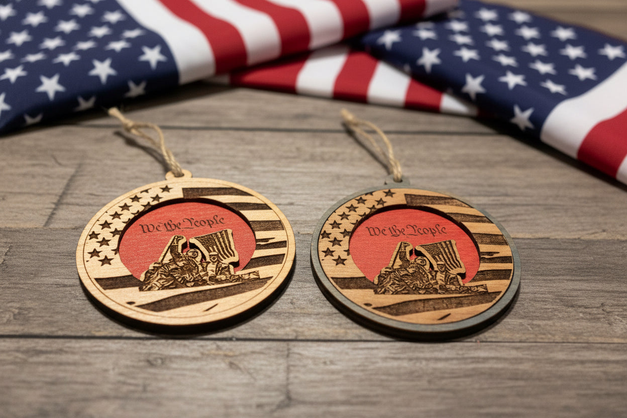 Layered wooden Trump ornament depicting his defiant stance after being shot while at a 2024 Butler, PA rally. Fight, fight, fight!